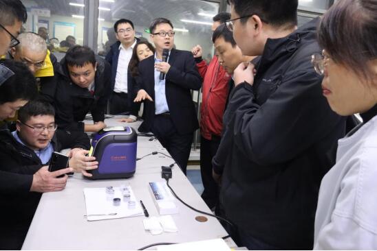 随后,考察团一行移步至公司三楼Cube100S产品生产线。针对炭黑行业的关键检测需求,8868体育官网登录入口技术专家在现场对Cube100S能量色散X荧光光谱仪、EDX3300SPLUS 侧照式单波长X荧光光谱仪两款仪器进行了专场讲解与实机演示,仪器表现出的高精度与高稳定性,给专家领导们留下了深刻印象。他们不时驻足,就仪器的检测原理、技术参数与8868体育官网登录入口工程师进行深入交流。