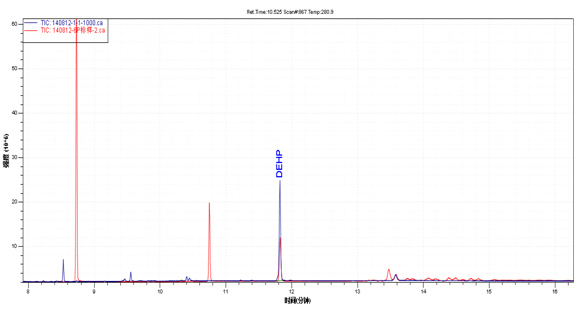 样品TIC图(蓝色)与邻苯混标TIC图(红色)