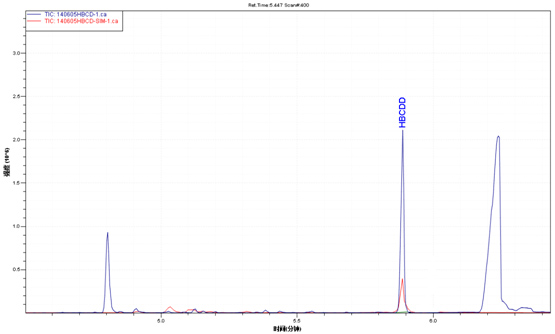 样品TIC图(蓝色)与六溴环十二烷标准品TIC图(红色)