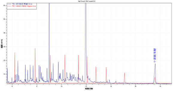 样品TIC图(蓝色)与多溴联苯醚混标TIC图(红色)