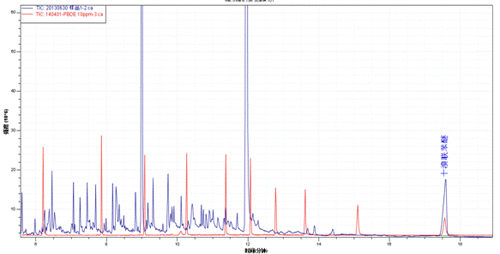 样品TIC图(蓝色)与多溴联苯醚混标TIC图(红色)