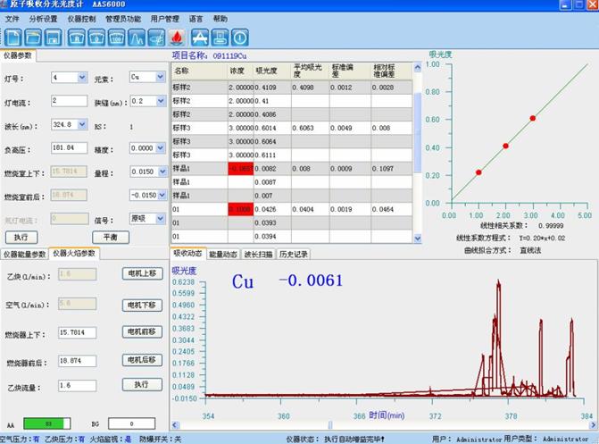 样品测试:于原子吸收光谱仪波长324.7nm处,使用空气-乙炔火焰,以水调零,测量试液的吸光度,减去随同试料的空白试验溶液的吸光度,从工作曲线上查出相应的铜浓度。