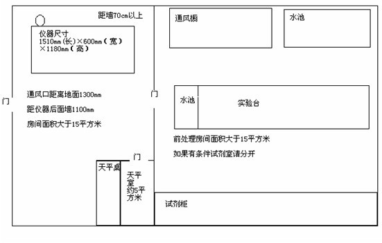ICP-2000型ICP扫描光谱仪的外形尺寸为1510mm(长)×600mm(宽)×1180mm(高),重量为300kg ,发货时四角装有减震器,仪器运到用户后卸下减震器,换上螺丝杆,当仪器选好位置后,将螺丝杆旋出使四角轮悬空,调节螺丝杆使仪器至水平,为保持仪器性能稳定及便于维护,ICP-2000 周围必须留出供维护人员维护仪器所需的空间(安装台距后面墙面至少70cm)