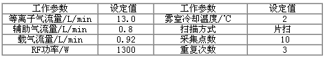 以10.0ng/mL Li 、Co 、In 、Ce 、U 和Bi混合调谐液优化仪器工作参数,使仪器灵敏度最佳,同时确保氧化物及双电荷产率低于3%,具体工作参数见表1。在仪器最佳工作参数条件下,以内标法进行测试。