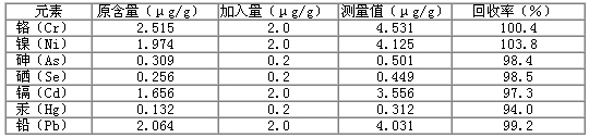 Hg标液单独为一组。Cr 、Ni 、As 、Se 、Cd 和Pb 标液用各元素10μg/mL的标液稀释至所需浓度。配制Hg标液时加入0.1mL 20 μg/mL金标准溶液。分析结果(表2)显示,这7种元素的线性方程的相关系数为0.9996~1.000 ,检出限为0.008~0.165ng/mL。