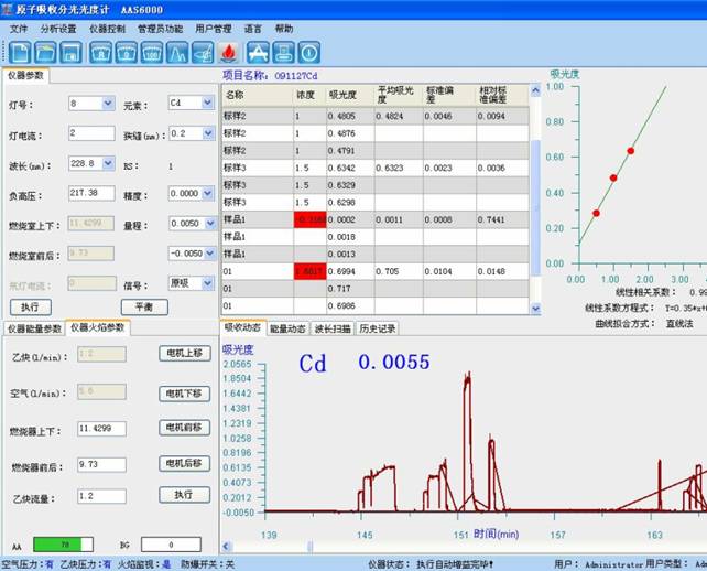 于原子吸收光谱仪 228.8 nm 处,使用空气-乙炔贫燃火焰,以水调零,测量试液的吸光度,减去随同试料的空白试验溶液的吸光度,从工作曲线上查出相应的镉浓度。