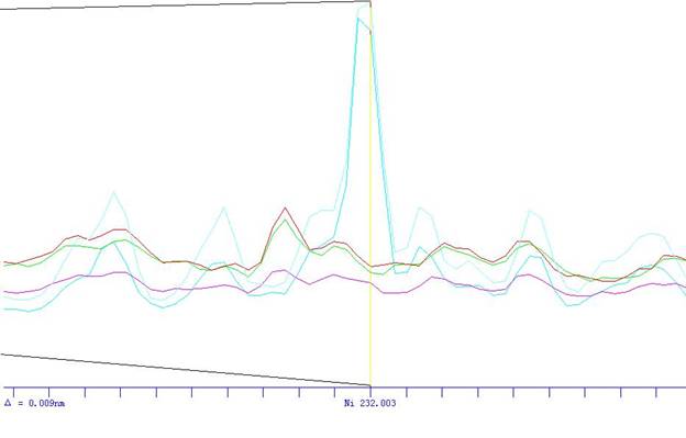 根据ICP软件谱线库提供所有元素不同谱线,首先选择被测元素灵敏度高的谱线,其次考虑不受样品基体及被测元素相互之间干扰小的谱线的原则,选择分析线如下。