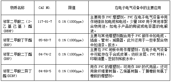 表一. RoHS 2.0新增4项邻苯二甲酸酯物质清单