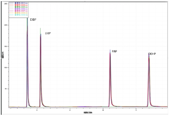 图2. 4种邻苯二甲酸酯标准溶液线性谱图叠加