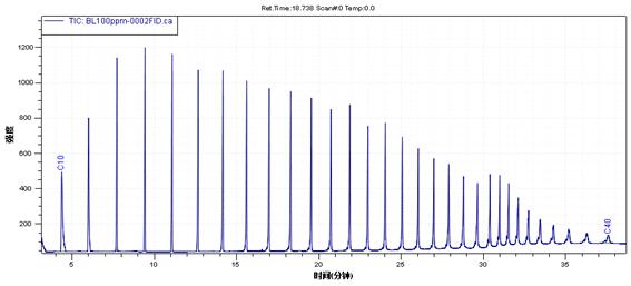 土壤和沉积物中的石油烃(C10-C40),经提取、净化、浓缩、定容后,用带氢火焰离子化检测器(FID)的气相色谱仪检测,根据保留时间窗定性,外标法定量。根据石油烃(C10-C40)保留时间窗对目标化合物进行定性,即从正癸烷(包含)出峰开始时开始,到正四十烷(包含)出峰结束时进行积分,计算石油烃(C10-C40)的总峰面积。