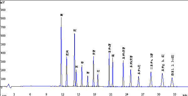 16种多环芳香烃标准品液相色谱图如下: