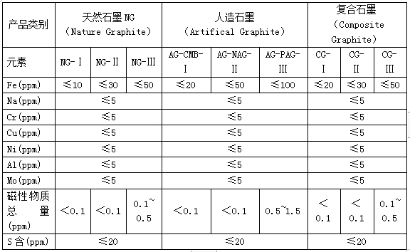 表1:不同类别的锂离子电池石墨类负极材料的元素含量限定技术指标