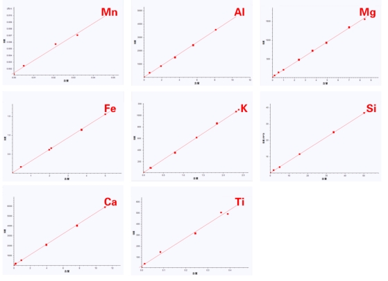 设定适当的测量条件,使用X射线荧光光谱仪扫描一系列含量已知的石墨标准物质或石墨二次标样,该系列样品中需关注元素Mg、Al、Si、K、Ca、Ti、Mn、Fe等元素含量与强度的一次线性校正工作曲线。然后,对未知石墨样品进行测量。