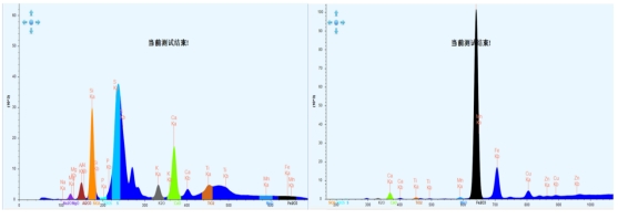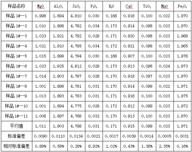 图3为石墨1#样品的X射线荧光谱图,从谱图可知,样品的含有少量Mg、Al、Si、P、K、Ca、Ti、Mn、Fe等元素。使用该样品进行重复性测试之后,检测结果中计算了对应元素的氧化物含量,测试结果中呈现出较好的重复性。