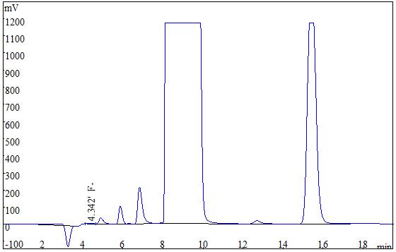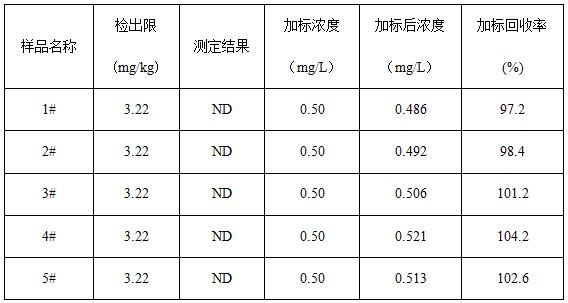 取5种不同颜色的涂层试样,各称取0.2g(精确至0.0001g),采用氧弹燃烧后冷却定容,经0.22μm的水系滤膜过滤后上机得到样品谱图,如下图3所示,5种涂层试样的测定结果均低于方法检出限,同时对5种试样进行了加标处理,加标回收率在97.2%~104.2%之间。测试数据详见表2。