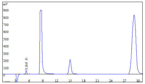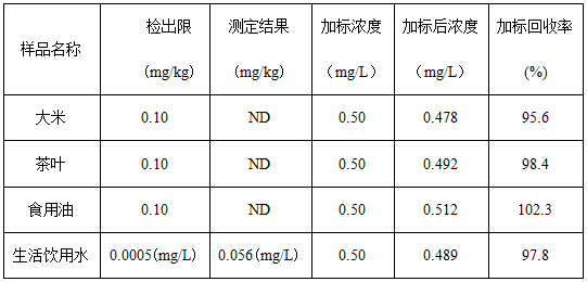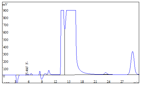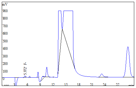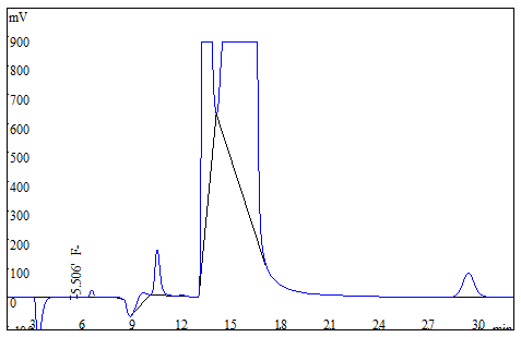 将大米、茶叶试样分别粉粹后过筛,各称取0.25g(精确至0.0001g),于氧弹燃烧仪进行燃烧,冷却后定容,经0.22μm的水系滤膜过滤后上机得到样品谱图,如下图3、图4所示;食用油样品直接称重后进行氧弹燃烧,测试得到的谱图如图5所示;生活饮用水直接上机后得到样品谱图详见图6。其中大米、茶叶、食用油中氟离子的测定结果均低于方法检出限,同时对4种试样进行了加标处理,加标回收率在95.6%~102.3%之间。测试数据详见表2。