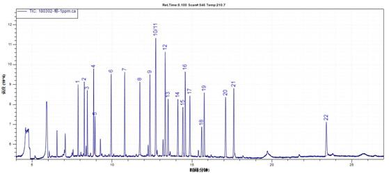 测定方式:TIC(FULL SCAN)定性(扫描范围:45-450amu),SIM模式定量。