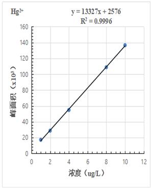 按照混合标准溶液浓度1.0µg/L、2.0.µg/L、4.0µg/L、8.0µg/L、10.0µg/L 进样得到色谱图,计算其峰面积,以浓度和峰面积绘制标准曲线,线性相关系数均大于0.999,结果详见图2-1~2-3。