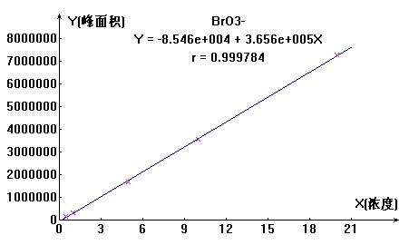 按照溴酸根各浓度点依次进样,计算其峰面积,以浓度和峰面积绘制标准曲线,线性相关系数为0.9997,结果详见图2。
