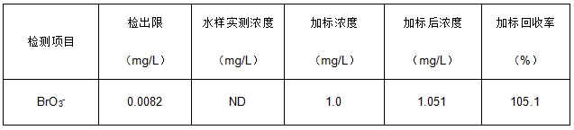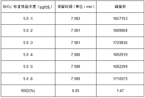 取5.0µg/mL溴酸根标准溶液重复进样6次,考察保留时间和峰面积的重现性,重现性结果详见表3。