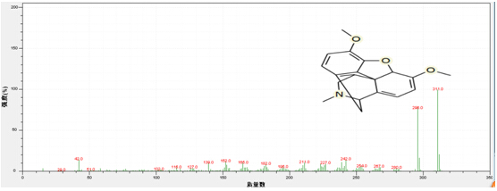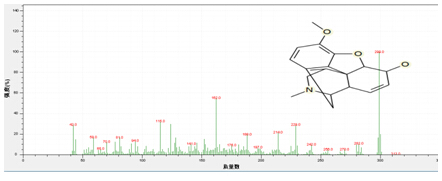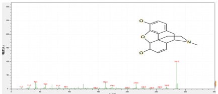利用罂粟壳生物碱的理化性质,样品在强酸环境下(pH:1-2),采用气相色谱质谱联用仪进行检测。采用保留时间和标准质谱图特征离子进行定性,外标法定量。